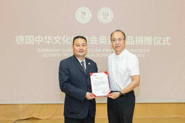 仪式现场,首都体育学院副院长左伟向德国中华文化促进会执行会长王志文颁发捐赠证书。据了解,230件珍贵奥运藏品包括1928年第9届阿姆斯特丹奥运会图册、1936年第11届柏林奥运会明信片等。
